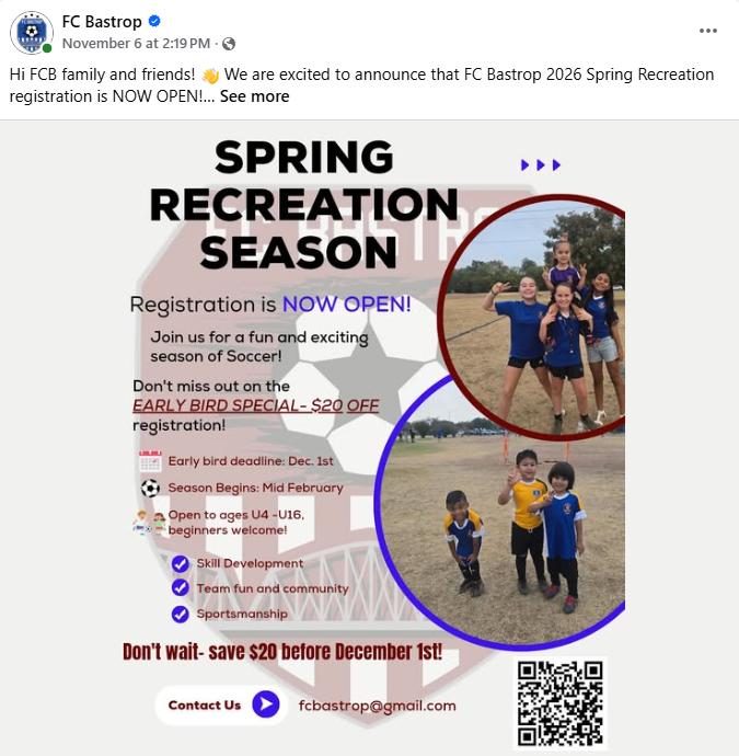 FC Bastrop is a local youth soccer association geared to nurture children and young adults in their development both as athletes and as people. We formed this league to provide the Bastrop community with another option for soccer players. Every player, regardless of skill level, is valued as a person and is readily accepted as a contributing member of the team. We provide a firm and supportive environment to build self-confidence and self-esteem. Successes are praised while mistakes are corrected with discretion, patience and a positive attitude. Our teams will be a community of players striving towards a common goal, working together, encouraging each other, and building each other up along the way. Winning games is important and is goal, but it is not the only goal! Development is key. Since our mission is to teach the values that children will need to succeed as adults, we will avoid any practice that teaches winning at the expense of fair play.
